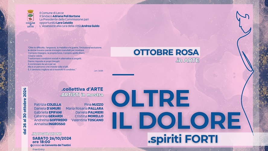 “Oltre il dolore – Spiriti forti” è il titolo della mostra che sarà inaugurata sabato 26 ottobre, alle 18, nell’ex Convento dei Teatini, a Lecce. L’iniziativa si inserisce nella campagna di informazione e prevenzione “Ottobre rosa”, ed è promossa dalla presidente della commissione consiliare Pari opportunità, Lara Cataldo, insieme con il sindaco Adriana Poli Bortone e l’assessore alla Cura della città, Andrea Guido.