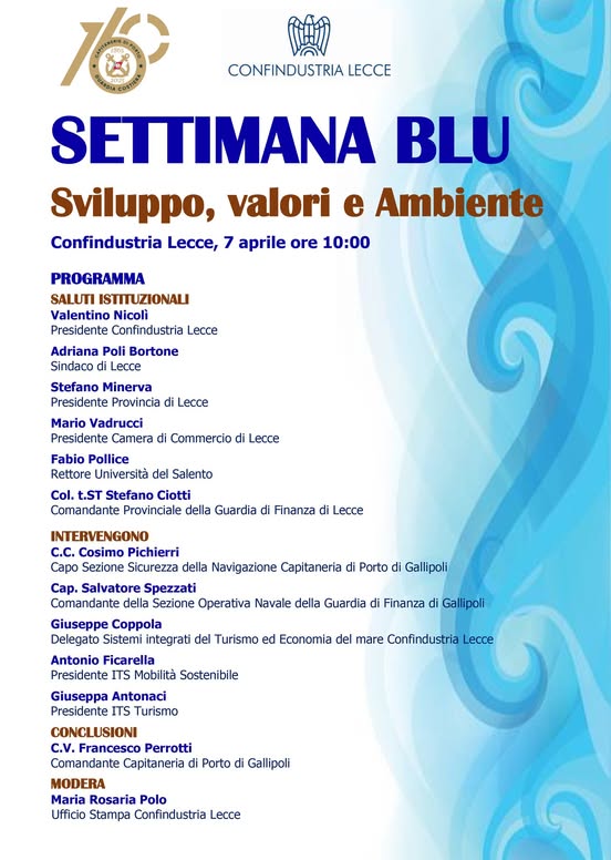 Rriflessione e dialogo sul futuro dell’economia marittima a Lecce, durante il convegno “Settimana Blu: Sviluppo, valori e ambiente”. L’incontro, promosso dalla capitaneria di porto di Gallipoli in collaborazione con Confindustria Lecce, rientra nell’ambito della Settimana Blu 2025, iniziativa regionale dedicata alla promozione della cultura marinaresca e alla sensibilizzazione ambientale.