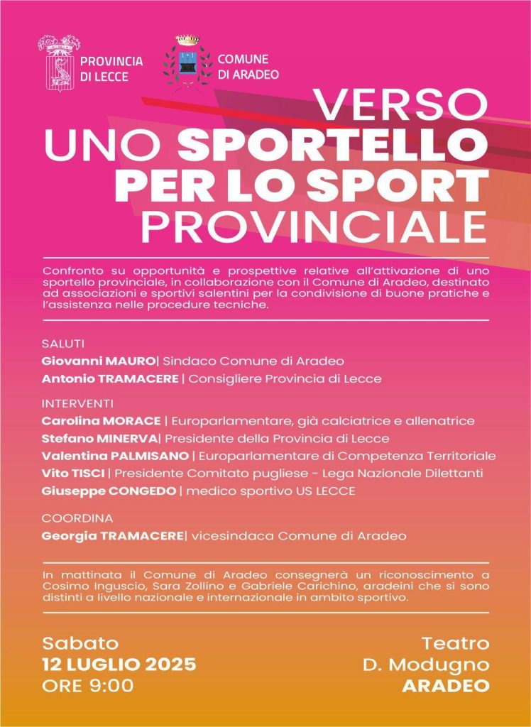 Un confronto sull’opportunità di attivare uno Sportello Provinciale, in collaborazione con il Comune di Aradeo, destinato ad associazioni e sportivi salentini per la condivisione di buone pratiche e l’assistenza nelle procedure tecniche. E’ questo il tema dell’incontro “Verso un Sportello per lo sport provinciale”.