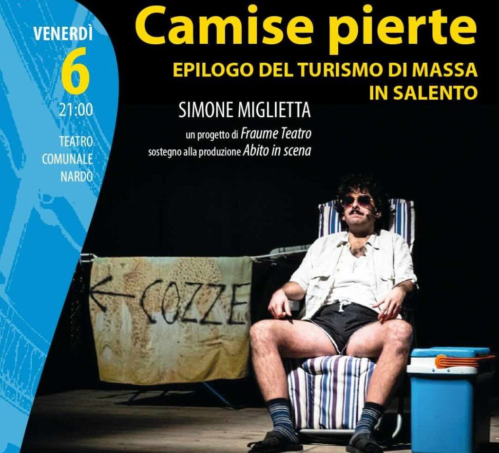 Simone Miglietta in scena a Nardò venerdì 6 marzo, con lo spettacolo "Camise Pierte – Epilogo del turismo di massa...
